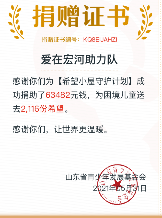 為幫助更多的困境兒童改善學習生活環(huán)境,在“六一”兒童節(jié)、騰訊“520公益日”來臨之際,按照共青團鄒城市委、集團黨委部署要求,5月20日,集團團委響應號召發(fā)起“愛在宏河助力隊”,積極組織發(fā)動集團各公司、合作企業(yè)為“希望小屋”項目進行網(wǎng)上募捐。集團黨員干部、職工、青年、團員積極踴躍參與共計3084人次,募集資金63482元。