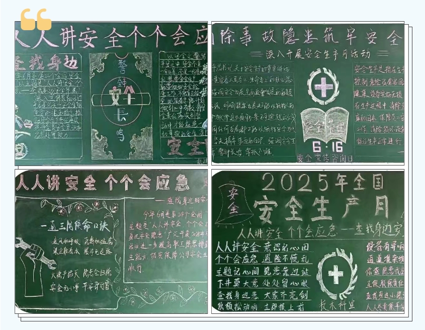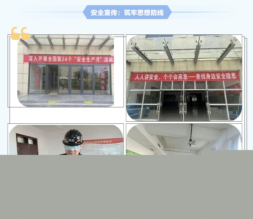 為營造“安全生產(chǎn)月”活動的良好氛圍,我礦在辦公樓、掘進樓、餐廳、入井走廊等顯著位置懸掛了“安全生產(chǎn)月”活動條幅,組織“五科”專業(yè)科室繪制宣傳板報,廣泛宣傳,進一步引起全體干部職工對安全生產(chǎn)的廣泛關注和高度重視,并常態(tài)化進行自救器盲戴培訓、“六必知”知識考核,營造良好學習氛圍。