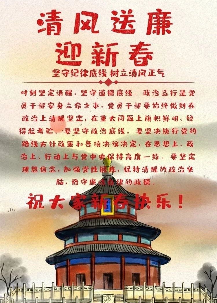 “廉不廉看過年,潔不潔看過節(jié)”,春節(jié)是廉潔風(fēng)險(xiǎn)多發(fā)、易發(fā)的敏感時(shí)期,各級(jí)黨組織要切實(shí)履行黨風(fēng)廉政建設(shè)主體責(zé)任,做好廉潔提醒,抓早抓小,通過多種形式教育引導(dǎo)全體黨員恪守紀(jì)律規(guī)矩底線,自覺遵守廉潔自律各項(xiàng)要求,以身作則、嚴(yán)于律己,不打折扣、不搞變通,嚴(yán)防“隱形四風(fēng)”、“變異四風(fēng)”問題反彈,確保紀(jì)律意識(shí)入腦入心。 集團(tuán)紀(jì)委將堅(jiān)持問題導(dǎo)向,進(jìn)一步加大監(jiān)督執(zhí)紀(jì)問責(zé)力度,暢通信訪舉報(bào)渠道,對(duì)于頂風(fēng)違紀(jì)問題,一律給予嚴(yán)肅處理,并對(duì)典型案例進(jìn)行通報(bào)和曝光,持續(xù)釋放執(zhí)紀(jì)問責(zé)越來越嚴(yán)的強(qiáng)烈信號(hào),確保節(jié)日期間風(fēng)清氣正。 事成于氣正,業(yè)興于風(fēng)清。讓我們立即行動(dòng)起來,從我做起、從小節(jié)做起,嚴(yán)格遵守《中國(guó)共產(chǎn)黨廉潔自律準(zhǔn)則》、《國(guó)有企業(yè)領(lǐng)導(dǎo)人員廉潔從業(yè)若干規(guī)定》、中央“八項(xiàng)規(guī)定”,嚴(yán)守紀(jì)律,嚴(yán)明規(guī)矩,自覺提升思想道德境界,廉潔齊家,自覺帶頭樹立良好家風(fēng),確保全體黨員領(lǐng)導(dǎo)干部、員工過一個(gè)歡樂祥和、 文明節(jié)儉、風(fēng)清氣正的節(jié)日。 祝愿全體員工及家人節(jié)日快樂、身體健康、工作順利,闔家幸福!